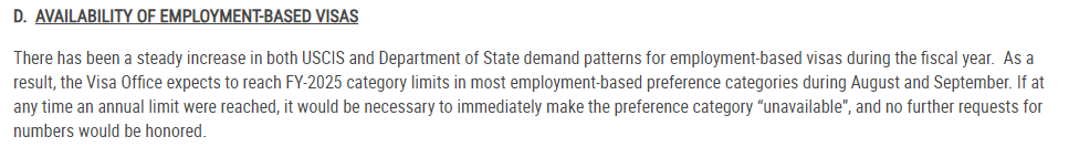 职业移民排期 1 表A最终裁定日(Final Action Dates) 中国大陆申请人 EB-1(含EB-1A):2022年11月15日,无变化 EB-2(含NIW):2020年12月15日,无变化 EB-3技术移民:2020年12月1日,无变化 EB-3非技术移民:2017年5月1日,前进30天 EB-5非保留名额项目:2015年12月08日,无变化 EB-5预留签证类别(农村/高失业区/基建项目):无排期 2 表B递交申请日(Dates For Filling) 中国大陆申请人 B-1(含EB-1A):2023年1月1日,无变化 EB-2(含NIW):2021年1月1日,无变化 EB-3技术移民:2020年12月22日,无变化 EB-3非技术移民:2018年1月1日,无变化 EB-5直投及中心区域项目:2016年10月1日,无变化 EB-5预留签证类别(农村/高失业区/基建项目):无排期 ▌注意:这个月职业移民表B依旧不能使用! 2025年9月的绿卡排期是整个2025财年的最后一份排期。本次排期中,美国国务院对各个类别提出了一条预警: 不管是在移民局还是国务院,绿卡需求都在持续增长。因此,大多数就业类优先类别在8月或9月都存在名额提前用完的可能。一旦年度限额被触及,就必须立即将该类别设为“不可用”(Unavailable),并且不再受理任何新的号码申请。 表A表B是什么? 表A指的是申请移民签证和绿卡的最终裁决日,也被称为“批准排期”。如果申请人的优先日早于表A的日期,意味着排期到了,移民局或签证中心可对其移民申请进行最终审核、并决定是否签发绿卡。 目前新政EB-5仍旧保持无排期状态,是唯一对中国大陆申请人无排期的项目,对于计划快速赴美、尽快转换身份的申请人尤其利好。 但嘉诚海外专家提醒,需要注意隐形排期危机,建议有意向的家庭尽快规划递交,把握政策红利期。 一旦排期出现,当下“双递交”利好将不复存在。“双递交”允许在美申请人可同步提交 I-526E 移民申请和 I-485 身份调整申请,快至90天获得Combo卡(EAD工卡+AP回美纸),快速实现合法在美居留、自由工作、学习和生活,基本享受完整的绿卡权益。