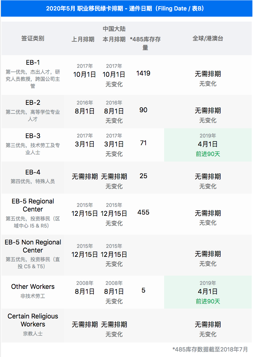 2020年5月 职业移民绿卡排期 - 递件日期(Filing Date / 表B)