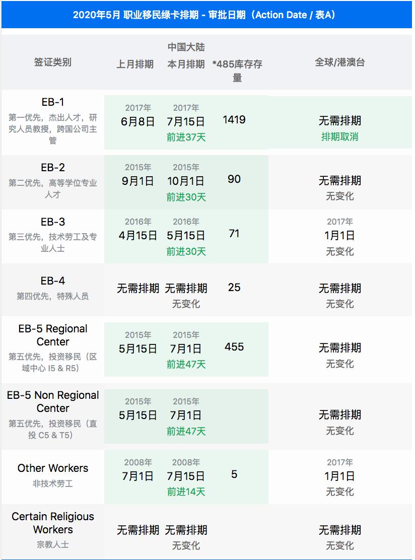 2020年5月 职业移民绿卡排期 - 审批日期(Action Date / 表A)